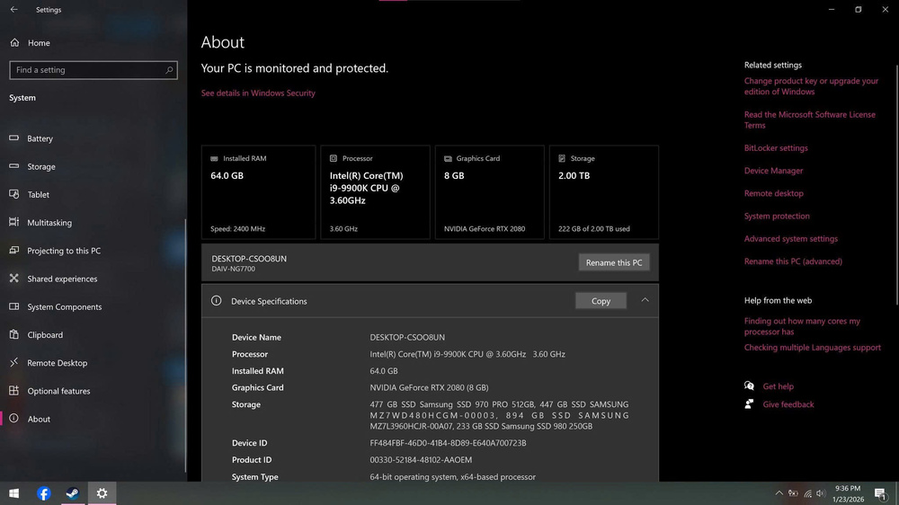 I have a Clevo P775TM1 laptop with a 4K display and the following specifications: 1/ Display: 4K resolution, 60Hz 2/ CPU: Intel Core i9-9900K (full box, diamond packaging) 3/ GPU: RTX2080 8GB 150W 4/ RAM: Samsung 16GB x 4, 2666MHz 5/ Hard Drives: - Samsung 980 256GB - Samsung 970 Pro 512GB - Samsung SM843TN MZ7WD480HCGM 480GB SATA SSD - Samsung SSD PM897 MZ7L3960HBLT-00A07 960GB SATA 6Gb/s 6/ Cooling System: Water cooling Will this configuration be outdated by 2026? I can still play AAA games well at high graphics settings. Does anyone still use it? Please share your experience with me.