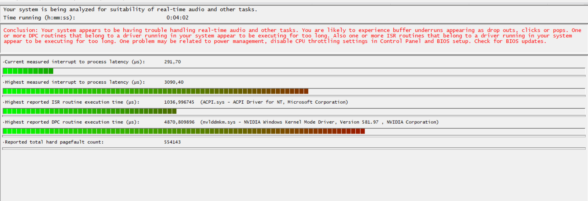 some, it confirms storport.sys + iaStorVD.sys were interfering before (a clean fresh windows install after the BIOS change is highly recommended for perfect driver stack) did you uninstall the Intel Intel Rapid Storage / RST drivers and revert to using windows native drivers? In Device Manager > Storage controllers > uninstall any remaining Intel RST entries (right-click > uninstall device (select to also delete drivers), reboot). Let Windows use its standard NVMe driver. > Rerun LatencyMon - storport/iaStorVD spikes should drop significantly. ACPI.sys and kernel stuff here point to throttling. Disable CPU features like Intel SpeedStep or C-States in BIOS to keep things steady during benchmarks. also for your NVME controller, look for firmware update for it or if possible test with alternate drive just for validation purposes. as for NVIDIA involvement clean reinstall drivers with DDU tool, and check for power saving modes in NVIDIA Control Panel that might be interfering. Quick tweaks (do these anyway): Power plan - High Performance (disable all sleep/USB suspend in advanced settings, in particular look for and sleep features for the NVME drive or power saving nonsense). Update BIOS + chipset drivers straight from Dell's site for your your exact model (do not count on the drivers that shipped with the default system). NVIDIA Control Panel > Manage 3D Settings > Power management mode = Prefer maximum performance. Uninstall Dell SupportAssist / Optimizer if installed (known latency contributors). Rerun LatencyMon after each change to confirm drops.