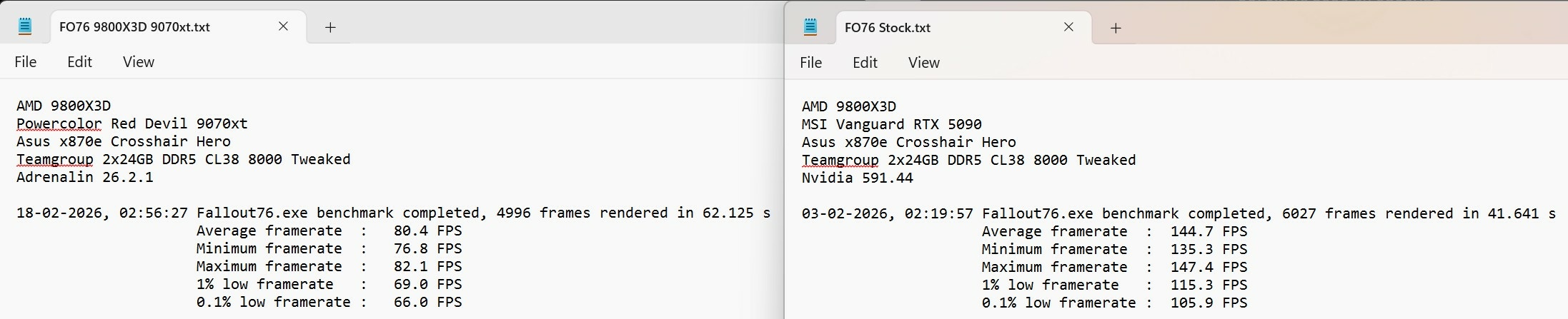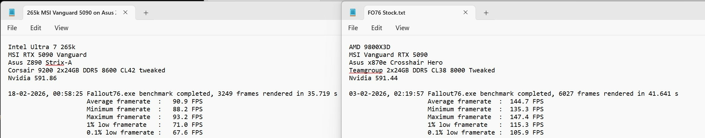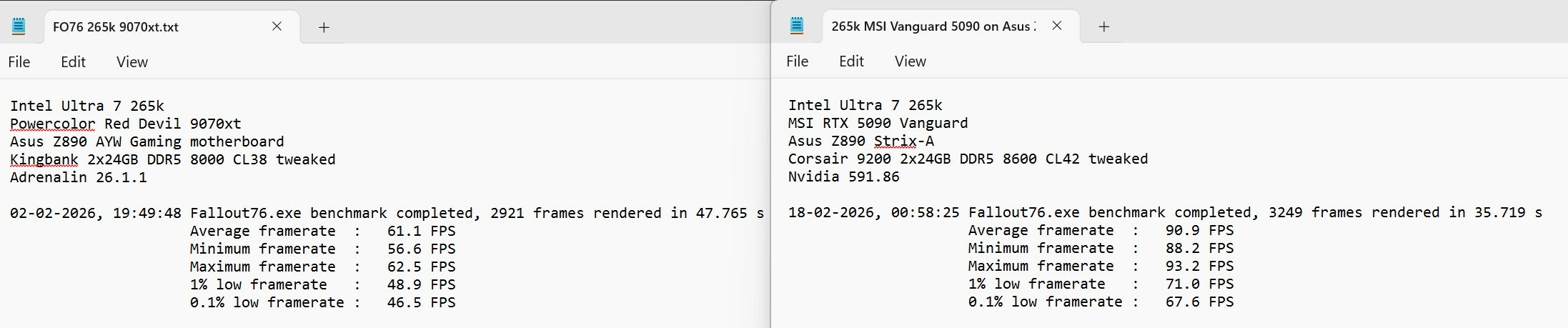 Finally got around to the ole switcheroo for some FO76 and WoW testing.... Welp, my 265k adventures have come to an end for potential on my main rig methinks. 9800X3D is just too beastly in Fallout 76 9070xt is just too weak on top of that but that was to be expected against a card that costs 3-6x more and is really a 5070ti/5080 contender depending on games played. Good news is for WoW at 4k? 265k tuned is a legit contender. It also was holding its own in Hogwarts too. For raids, I found it had almost that same smoothness and control of the lows like the SP109 14900KS in the wife's system. If all I played was WoW, I'd recommend a nice, tuned, cheap 265k on the cheapest board you could find. Problem of course is securing 8000+ DDR5 in the current market. Unfortunately I play equal parts Fallout76 and WoW both at 4k these days as my two main games and have for the last 3+ years and the X3D just massacres All of Intel's offerings in that game as it always has since I started testing with the 7800X3D several years ago vs the 12900k, 13900KS and eventually the 14900KS. I did manage to eeek out a little bit more performance on the Strix and 8600 tuned vs 8000 tuned with the better 265k being able to tune up quite nicely but it still couldn't hang but that's about right considering it couldn't hang even with the 14900k still churning along at 59/45/50 atm. Red Devil 9070xt was clocking over 3300 at stock in Fallout76. Much better than my Gigabyte 9070xt in the wife's system. 265k vs 9800X3D with MSI Vanguard 5090: 9070xt vs 5090 on 9800X3D: 9070xt vs 5090 on 265k: ----------------------------------------------------------------------------- Up next is a break down and cleaning of my main rig and install the MSI AI1600T PSU along with the WV2Pro and DDR5 cooling mod. I plan on holding onto my Vengeance 9200 sticks in anticipation for Nova..... -