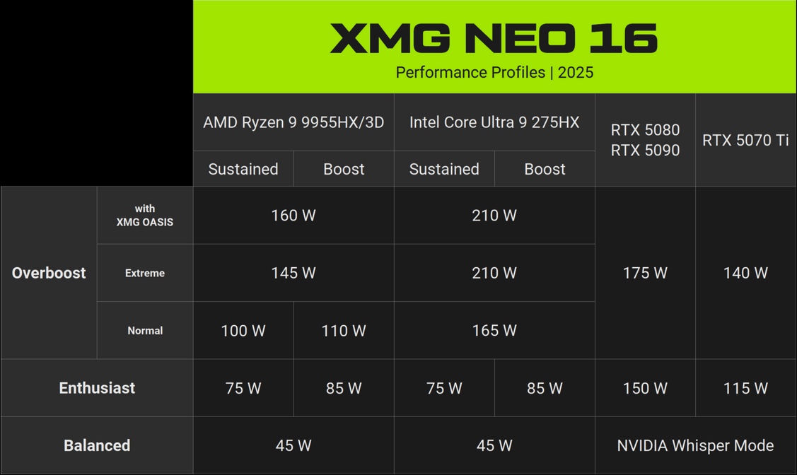 Release date : May 2025 9th gen AMD HX Fire Range CPU (Ryzen 9 9955HX and Ryzen 9 9955HX-3D) - 16cores/32threads Nividia Blackwell GPU (RTX 5070Ti, RTX 5080 and RTX 5090) Up to 96GB DDR5 5600MTs non-ECC memory 2 NVMe slots (1x PCIe4 + 1xPCIe5) Full driver support for Win 11 16-inch display (IPS or Mini-LED) - 2560x1600 - 16:10 ratio - 300Hz All-metal (aluminium) chassis Product page : XMG NEO 16 (A25) Useful information : XMG PRO & NEO 16 (2025): Deep dive and on-going updates Driver and Bios download portal (including Bios tuning guide and control center): XMG Downloads This laptop is also compatible with the latest portable watercooler Oasis Mk2 to reduce working temps and fan noise while increasing power limits. Power limits table for various configuration and performance profiles in Control Center : A complete and thorough written review from notebookchek : Review A shorter version in video : Video review I'll try to post a review from the version i purchased (see sig) with some benchmarks later.