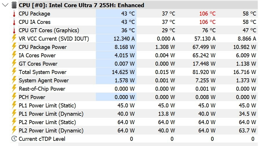 I'll put an internal photo with the fans in my mini-review. I use HWiNFO to see a lot of performance data (below is an extract from the long list of values). The PL1 dynamic value changes immediately when I change the fan speed (note that I have not investigated the BIOS settings or installed any other power management tools. What I would like is a slightly lower normal fan speed setting with correspondingly lower power limit but I've not seen any option for fine-tuning fan speed in the advanced BIOS when previously looking at the options.