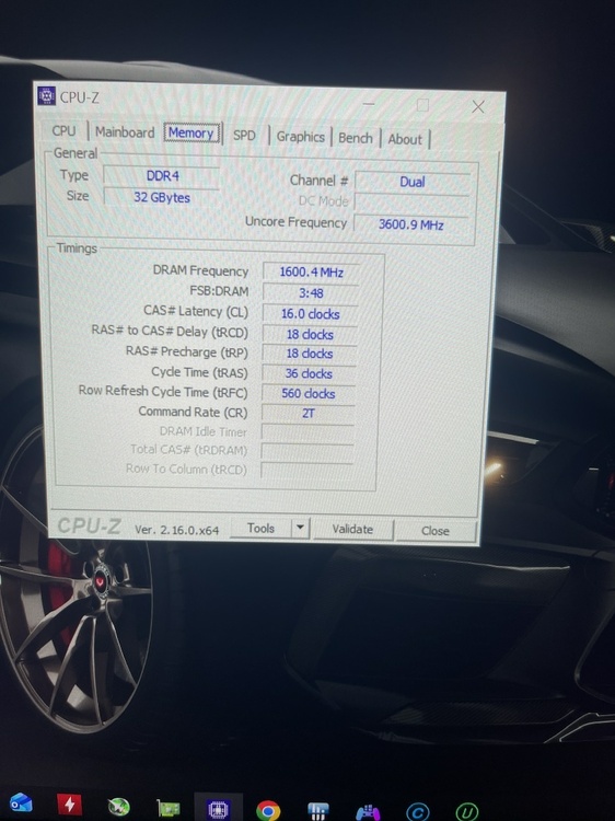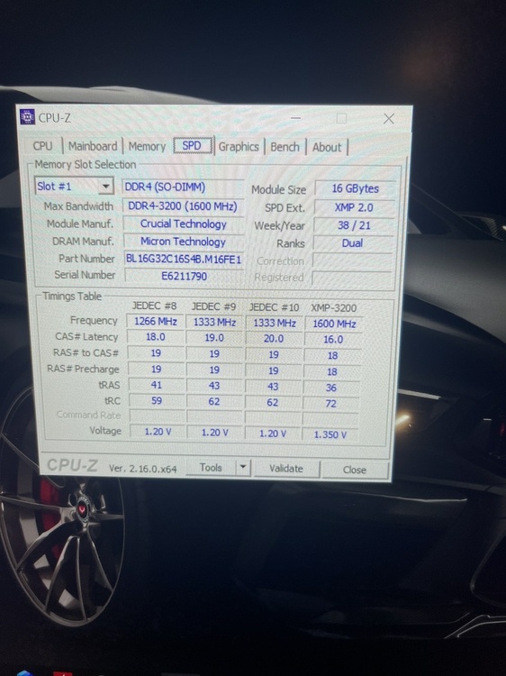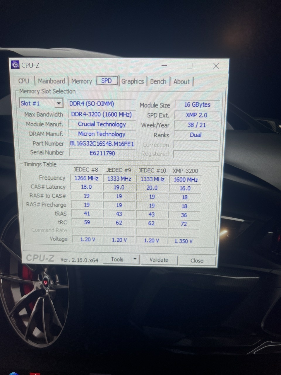 No one has managed to push the RAM on the Clevo P870 motherboard beyond 3350 MHz, and I don’t know why—especially since I installed an i9-9900KF processor. I bought a 2x16GB Crucial Ballistix kit rated at 2666 MHz, but it has an XMP profile for 3200 MHz with CL16 because it runs at 1.35V instead of 1.2V. By the way, this kit is very rare.