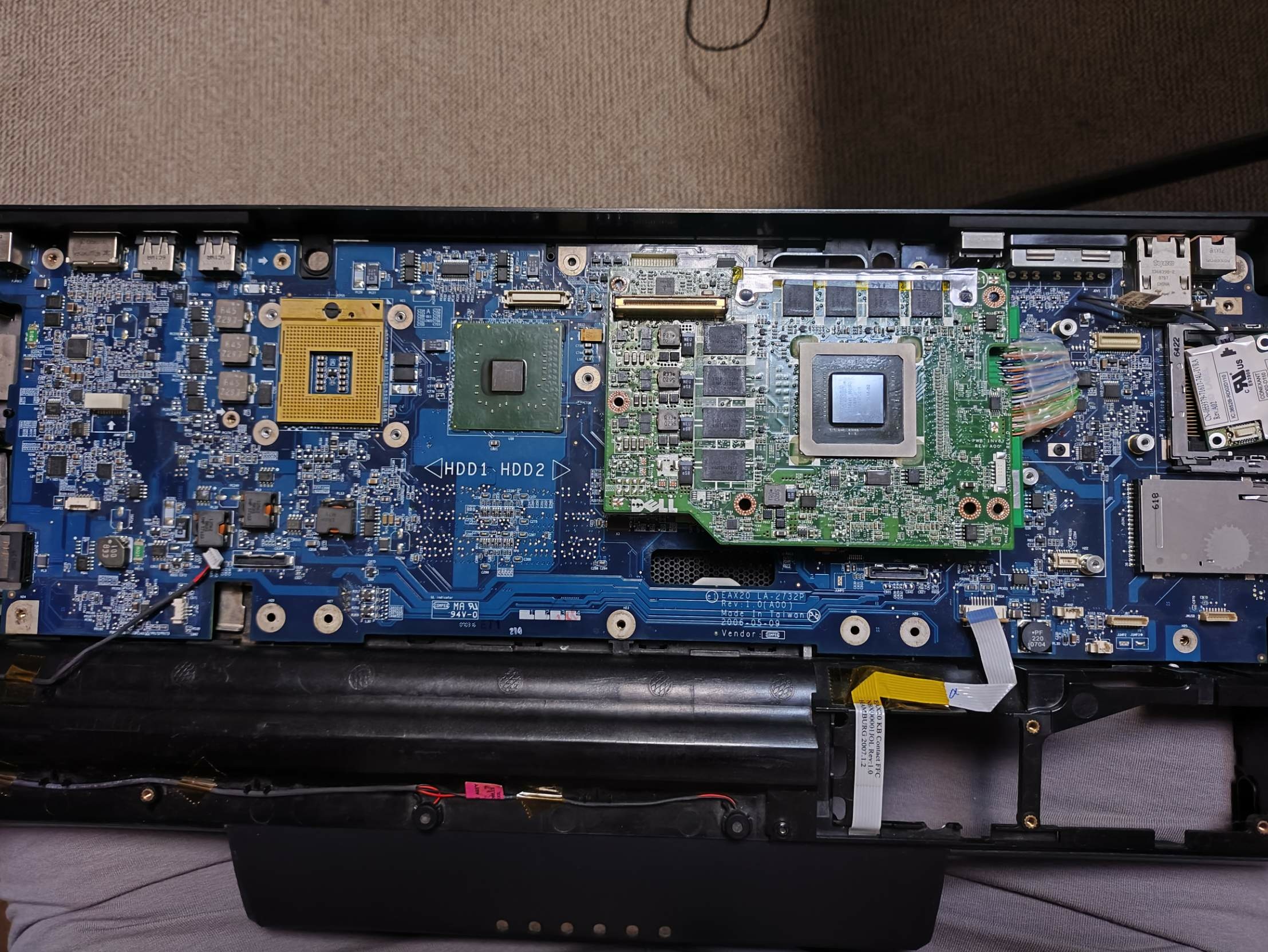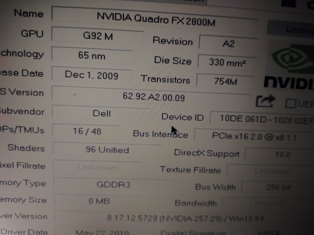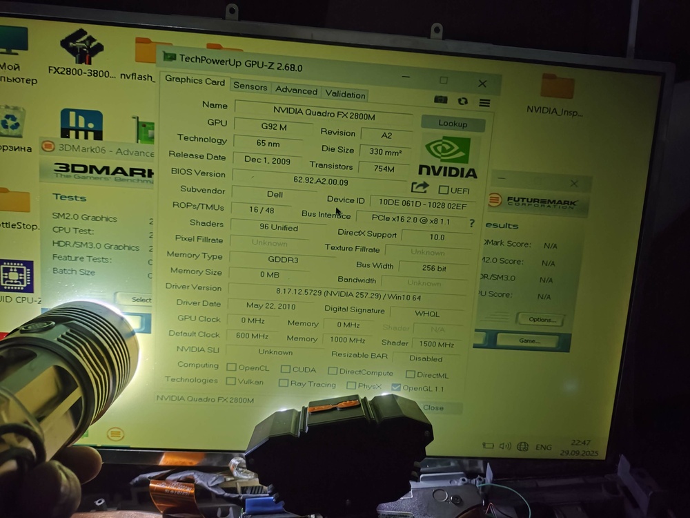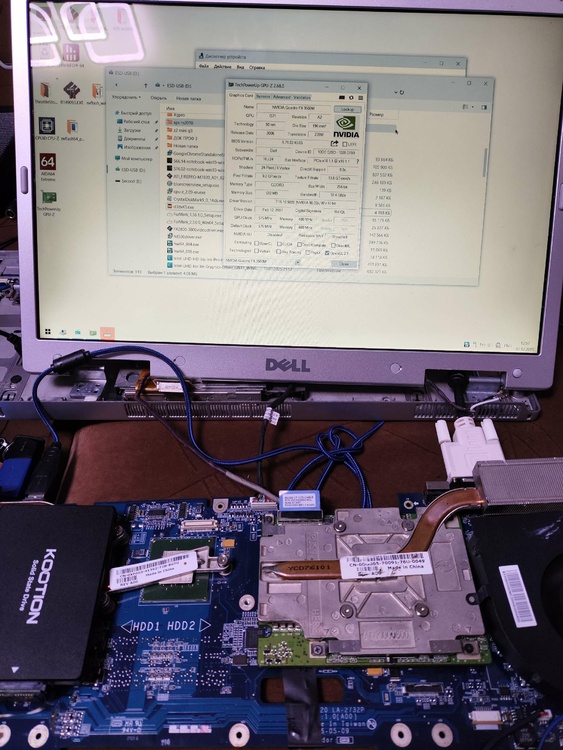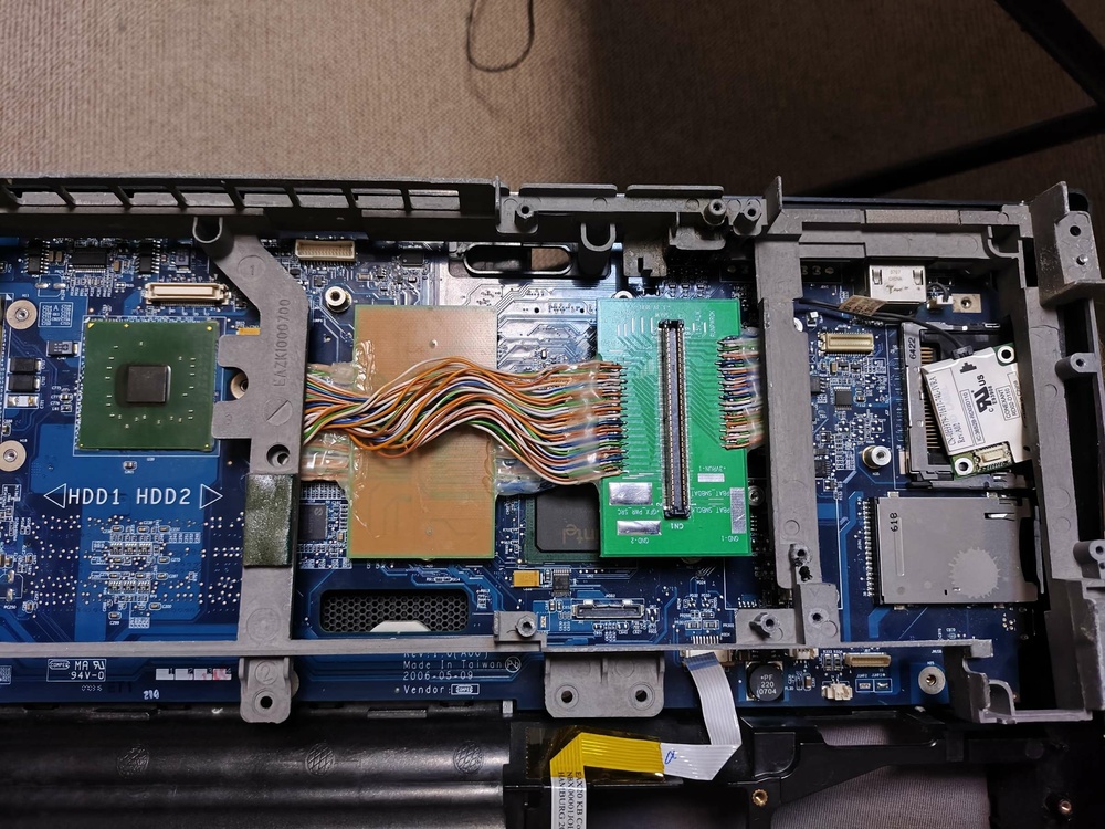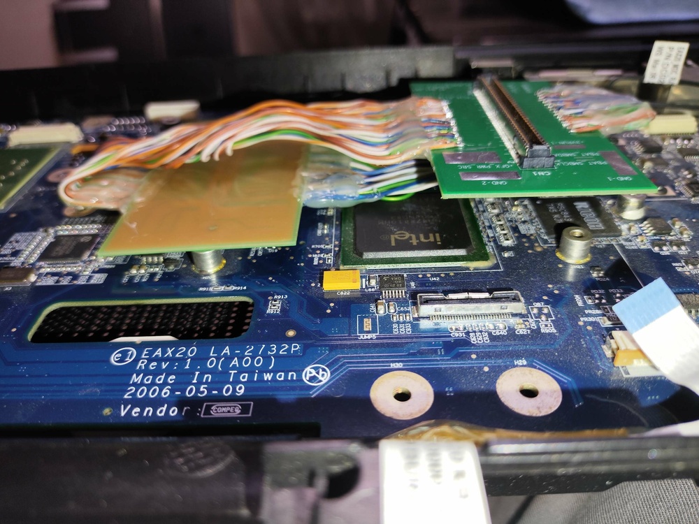 Hi. My project is still go. Im trying make adapter from dell xps m2010 /1710 motherboard to dell precision m6500 GPU (i have fx2800m with RGB 8bit LCD from precision m6500/m6400) and try to boot. First problem its almost always xps m2010 startup with lover clocks (1ghz) and something wrong in bios because boot windows time is 10 minutes, and CPU-z benchmark show 14 points ( core 2 duo 7400 at full speed (with ati x1800 gpu) with 2 cores show 378 points). Its very slow. But sometimes booted fine with full speed. Secondary problem is sometimes freezing without any doing, laptop just freezes. Third problem - if installed drivers - laptop freezes on boot logo win 10 and not booting at all. No BSOD no screen errors, just freeze logo and stuck. With standard drivers (Microsoft basic) laptop boots and works well but if booted on full speed core. I use lcd from m6500 Wled, and this lcd not having working led for showing display images, and i use external flashlight for seeing anything on lcd. Why i choose m6500 gpu - because its only one laptop what have on video cards 8 bit lvds output signal (remind what m2010 has 20,1 IPS 8bit lvds screen). Secondary my project - i bought on eBay quadro fx2500m from inspiron 9400, this card have 6 bit lvds output but working without custom adapter but only with DVI output and if you have original 17" lcd from dell inspiron /precision m90. Card is booting, on bios recognising property, drivers installing, but Nvidia panel not working, On 3dmark 06 i take max 4300 points, and video card sometimes booted and benchmark 3200 points (clock core and memory on high) but FPS on benchmarking slower (3200 vs 4400 point) - why this issue - i don't know- for me Mystery. If install drivers, win 10 start button and settings window show artifacts, no visible text only rectangles. But benchmark 3dmark working without graphics issues. Some photos my work and tests