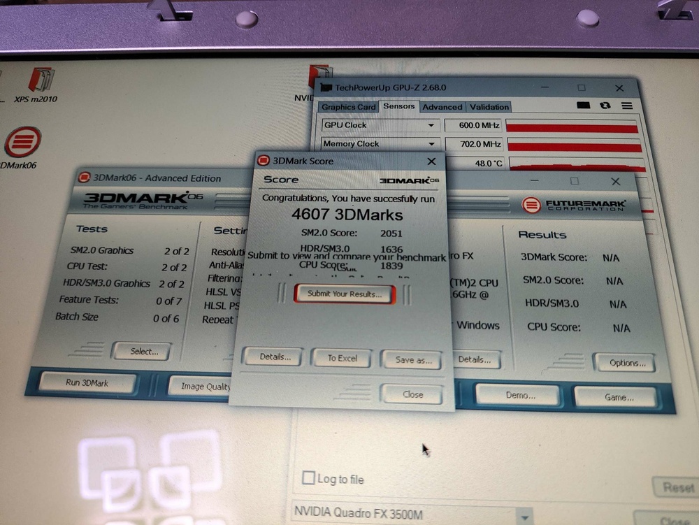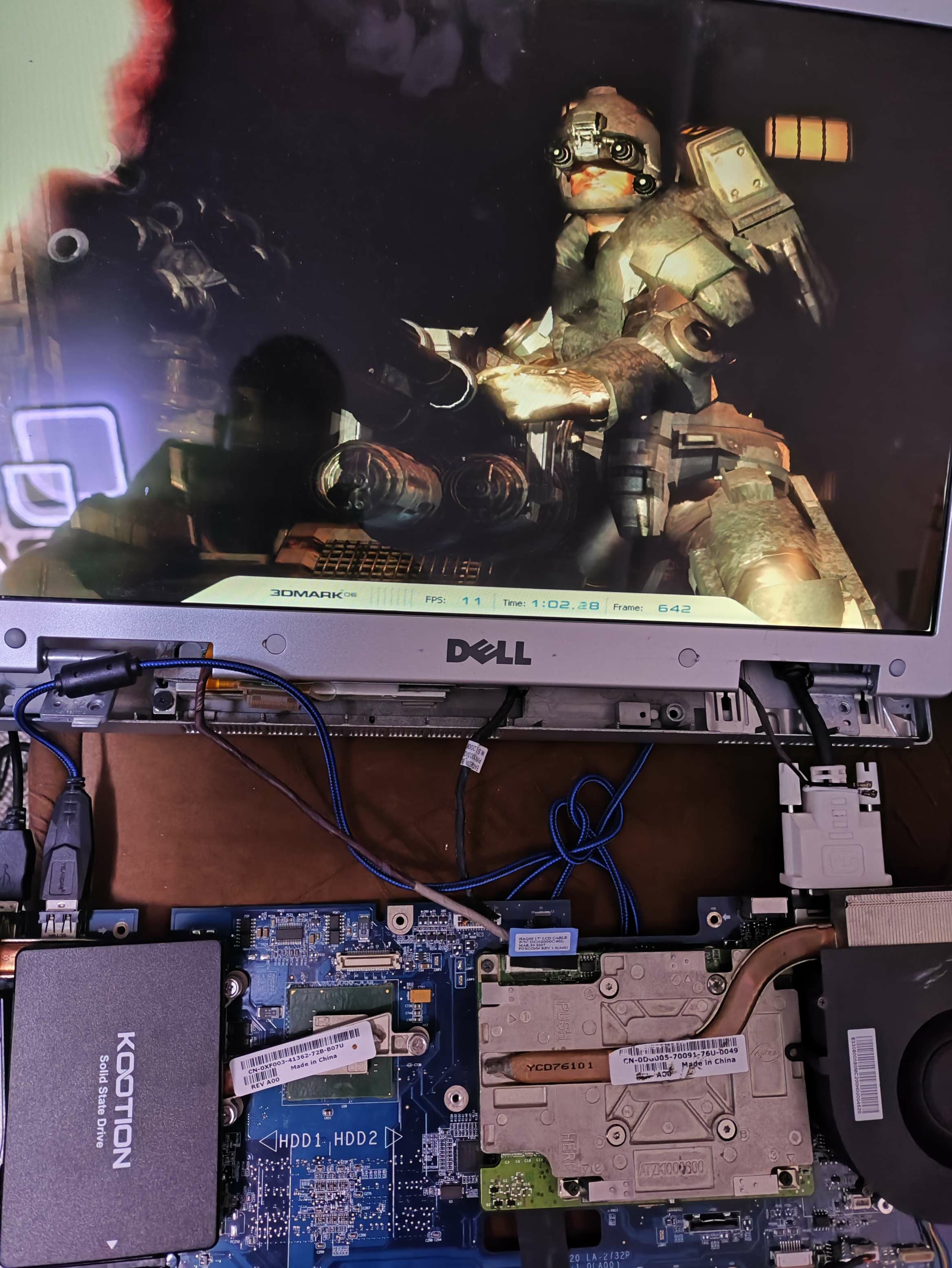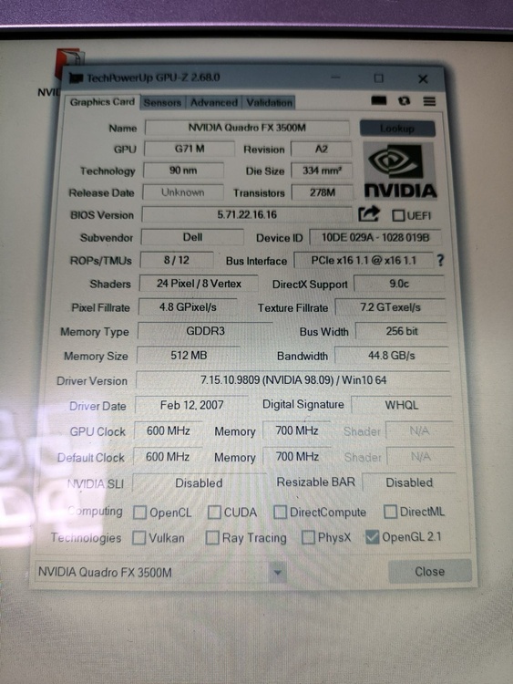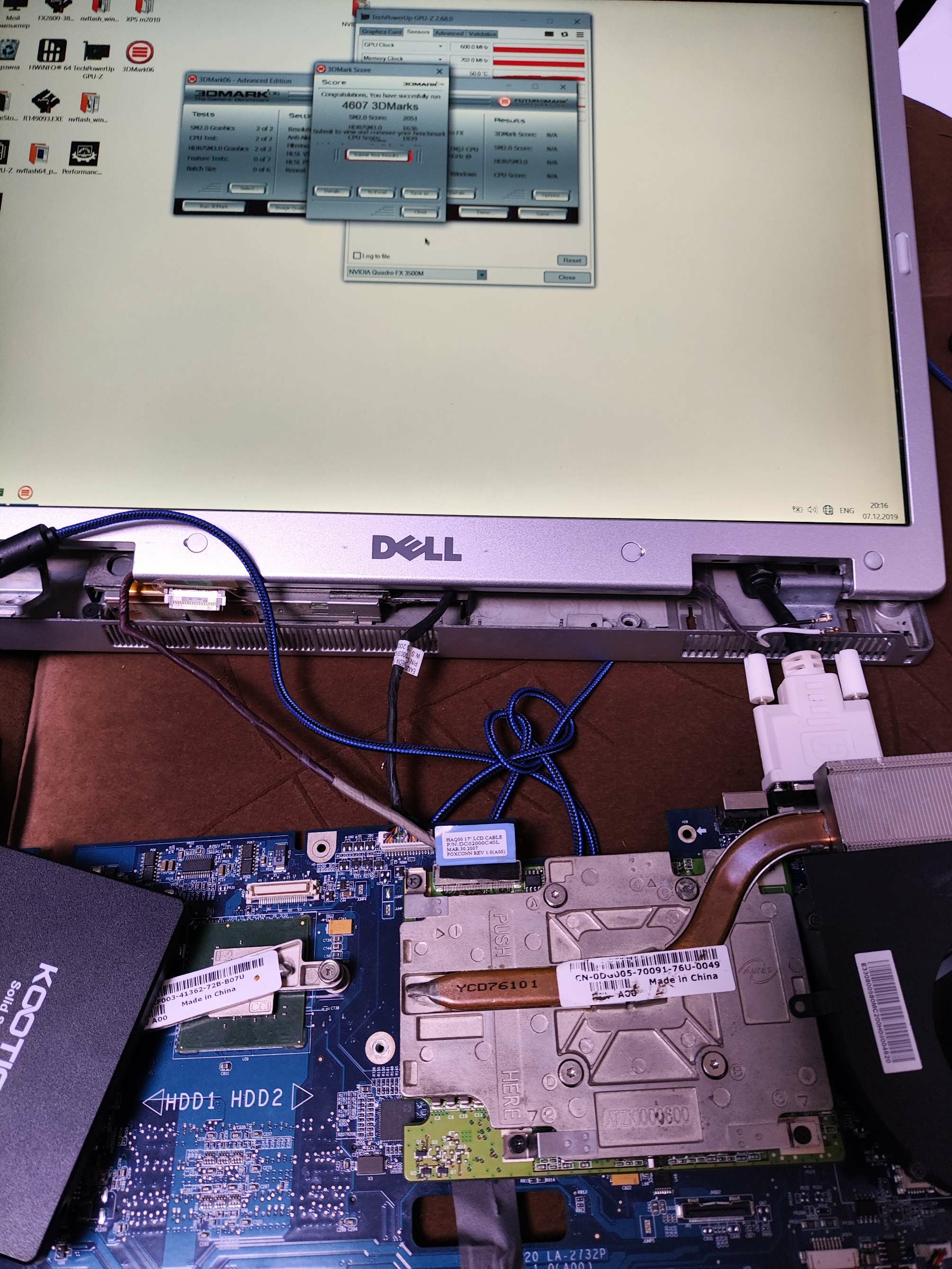 Hi. My project is still go. Im trying make adapter from dell xps m2010 /1710 motherboard to dell precision m6500 GPU (i have fx2800m with RGB 8bit LCD from precision m6500/m6400) and try to boot. First problem its almost always xps m2010 startup with lover clocks (1ghz) and something wrong in bios because boot windows time is 10 minutes, and CPU-z benchmark show 14 points ( core 2 duo 7400 at full speed (with ati x1800 gpu) with 2 cores show 378 points). Its very slow. But sometimes booted fine with full speed. Secondary problem is sometimes freezing without any doing, laptop just freezes. Third problem - if installed drivers - laptop freezes on boot logo win 10 and not booting at all. No BSOD no screen errors, just freeze logo and stuck. With standard drivers (Microsoft basic) laptop boots and works well but if booted on full speed core. I use lcd from m6500 Wled, and this lcd not having working led for showing display images, and i use external flashlight for seeing anything on lcd. Why i choose m6500 gpu - because its only one laptop what have on video cards 8 bit lvds output signal (remind what m2010 has 20,1 IPS 8bit lvds screen). Secondary my project - i bought on eBay quadro fx2500m from inspiron 9400, this card have 6 bit lvds output but working without custom adapter but only with DVI output and if you have original 17" lcd from dell inspiron /precision m90. Card is booting, on bios recognising property, drivers installing, but Nvidia panel not working, On 3dmark 06 i take max 4300 points, and video card sometimes booted and benchmark 3200 points (clock core and memory on high) but FPS on benchmarking slower (3200 vs 4400 point) - why this issue - i don't know- for me Mystery. If install drivers, win 10 start button and settings window show artifacts, no visible text only rectangles. But benchmark 3dmark working without graphics issues. Some photos my work and tests