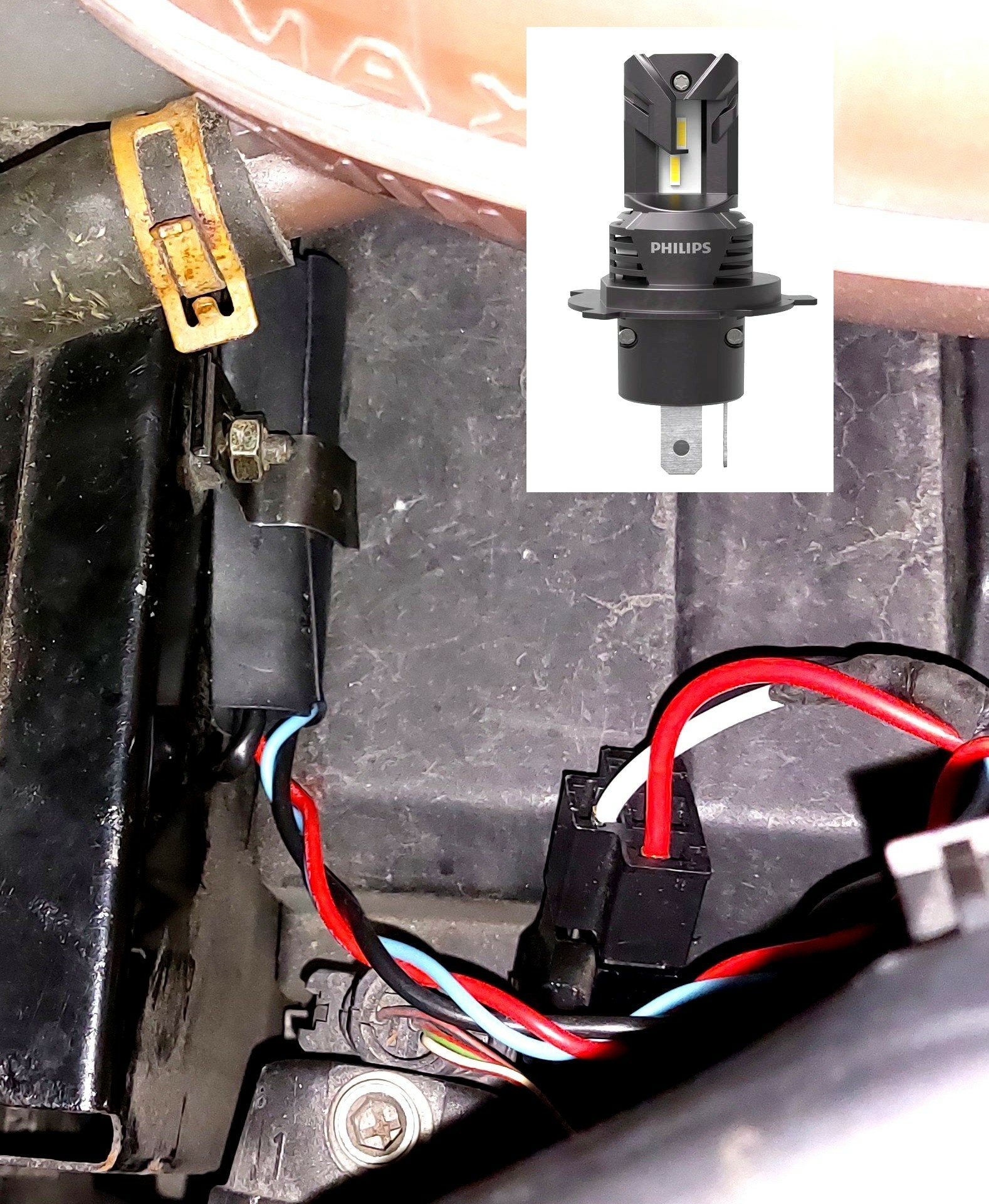 4. Recent small job, swapping those 'candlelight' halogen H4's to led H4's, which needs 'acceptance' from the electronics. Not a normal canbus on this old van, but some rough sensor that detected a total lamp failure. After some funny experiments found out the car was happy with just one single resistor (67 ohm, so no heat\drain) in parallel on one circuit. The Philips H4, not the strongest among leds but standard size so fits wo trouble (the stronger H4 leds got a large fan at the connector end). Now got light like if bought a new 50.000 $ car :O)