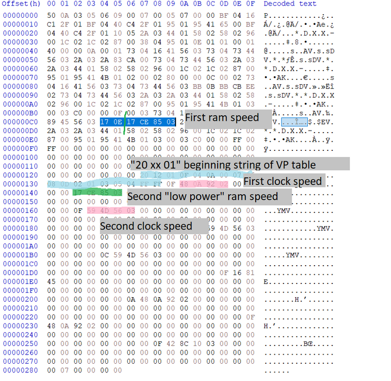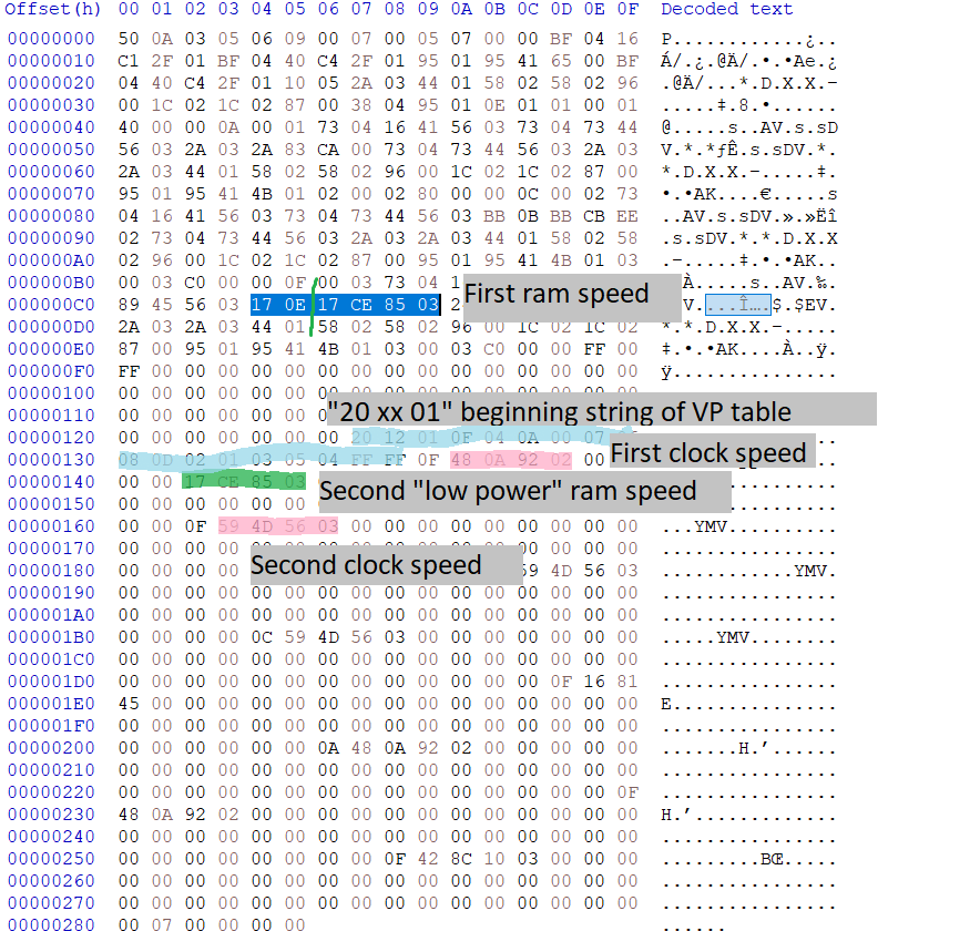 Hello @Ralph. I know it's been about a year since you posted. I have, like you, found where the GPU clocks and memory clocks are stored in the pascal quadro vbios -> the Virtual P state table that can be found thanks to ImHex... I will make a tool to allow users to change clocks in vbios once I have gathered all info needed + done tests on my quadro p3000. Did you find a way to reference the voltage for each clock ? Or is it just when applying a clock value that the card automatically decides what voltage to go to ? This is based on the vbios you posted here. Clock values are pretty close. Highlighted blocks must be read in little indian (17 CE 85 03 = 03 85 CE 17). And at the exception of the memory frequency 2x DDR. All values must be read by dividing the decimal value of the hex block (in little indian) by 2^15 Apparently memory frequency can't go above 1752Mhz on pascal quadro cards. -