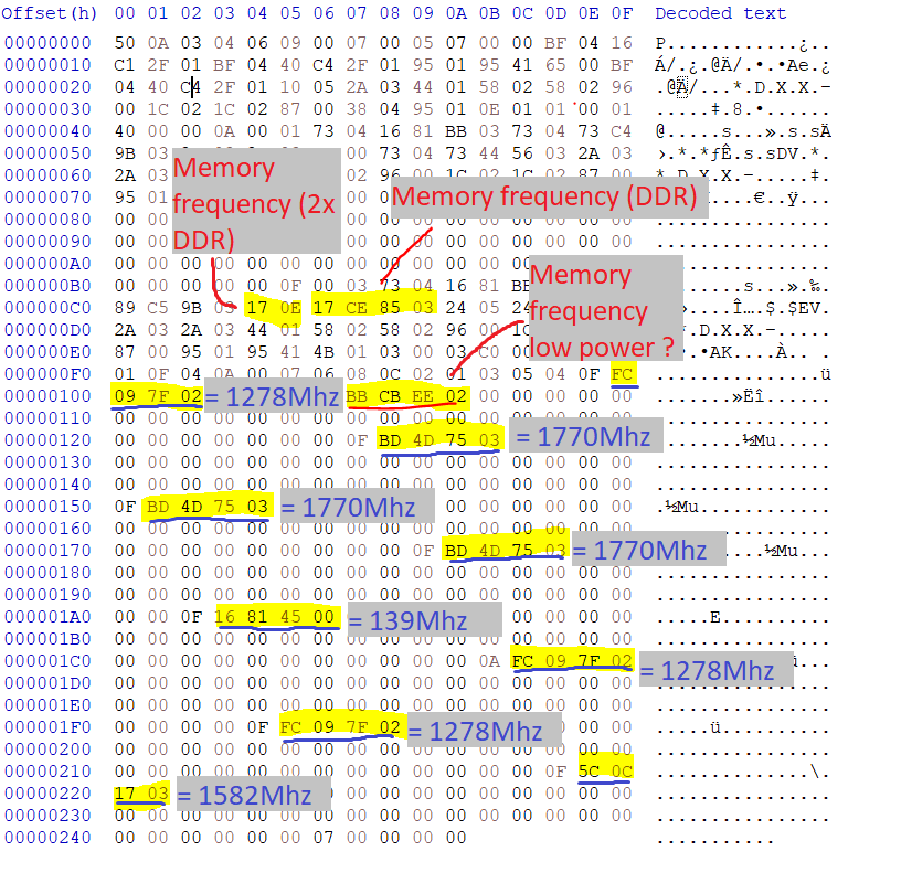 Actually out of curiosity, I went to inspect the "low power" ram frequency string out of a P5200 vbios that has ram speed of 1802Mhz. As you can see here : Despite the different layout : The first ram speed string with DDR value and 2xDDR value is highlighted in dark blue and the second string (that I called "low power" in the post before) is actually set to the same value of : you guessed it : 03 85 CE 17h = 59 100 695d -> devided by 2^15 = 1803 Mhz !! So I guess to overclock ram : users should change the first ram string containing the two DDR speeds as well as this second string that is located between the first P state entry and the second P state entry. This should, in theory, levitate the 1752Mhz memory lock. Testing needs to be done ! I won't have my p3000 for a while unfortunately. -