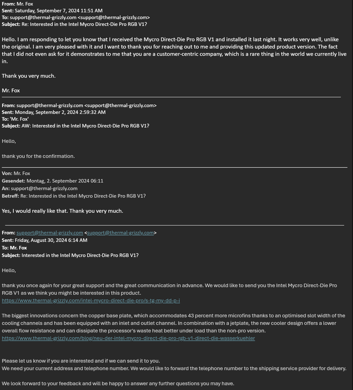 Papusan Posted September 9, 2024 Share Posted September 9, 2024 On 9/7/2024 at 9:02 PM, Mr. Fox said: I have to put in a plug for Thermal Grizzly. I purchased the Mycro LGA-1700 Direct Die block and it performed poorly compared to the IceMan Cooling block. I emailed them and asked for an RMA, provided the before/after temperature comparisons. They did not do an RMA, just apologized and issued a refund. Fast forward a few months, they contacted me, totally out of the blue, and offered to send me the updated product. I didn't ask for it. I replied and accepted and they sent it. Works great. Essentially the same thermal performance as the IceMan block. I like the design of the cold plate better. It has a rim around the die to contact the PCB, which adds support and spreads out the compression of the PCB into the socket instead of the die being the only point of contact. And, it makes a dam to keep the liquid metal confined to the die area. These results are without the chiller, in my hot (79°F) office. More extended stress test... Nice. A new water block will come for Arrow lake and socket 1851. Hmmm, I wonder if they will offer an coldplate upgrade or people need to buy an new Direct Die water block from Thermal Grizzly to get the best performance. Thermaltake confirms 71 CPU cooler models are fully compatible with Intel LGA1851 Much easier reuse the old cold plate for socket 1700 without direct die mount. 1 2 "The Killer" ASUS Z790 Apex Encore | 14900KS | 4090 HOF + 20 other graphics cards | 32GB DDR5 | Be Quiet! Dark Power Pro 12 - 1500 Watt | Second PSU - Cooler Master V750 SFX Gold 750W (For total of 2250W Power) | Corsair Obsidian 1000D | Custom Cooling | Asus ROG Strix XG27AQ 27" Monitors | Papusan @ HWBOT | Team PremaMod @ HWBOT | Papusan @ YouTube Channel Link to comment Share on other sites More sharing options...