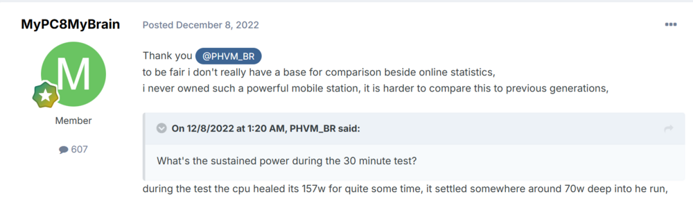 MyPC8MyBrain Posted Thursday at 07:42 PM Share Posted Thursday at 07:42 PM 5 hours ago, Easa said: unless you are in a tropical climate is Vegas "tropical" enough? On 12/9/2022 at 10:34 PM, MyPC8MyBrain said: These weren’t cherry-picked images. I simply went back to my older posts and selected the most recent ones I had shared. You’re free to read the thread from my first post onward, there are plenty of screenshots covering idle, load, and various test conditions. As for ambient: yes, I understand exactly what it means. Those measurements were taken under specific conditions that I already documented at the time, BIOS Cool mode, Windows Power Saver, and a controlled environment. When switching to Ultimate Performance, I explicitly noted the +10°C increase. None of this was hidden or misrepresented. Regarding efficiency: I never claimed architectural efficiency of Alder Lake exceeds Arrow Lake. My point was strictly about thermal behaviour under mobile constraints. Architectural efficiency on paper and real-world thermal behaviour in a confined chassis are not the same thing, and they often diverge. Your interpretation mixes two separate discussions: Silicon-level efficiency (input power -> compute output) Thermal behaviour and sustained performance in a mobile cooling budget The former favors newer architecture. The latter is heavily dependent on bin quality, power limits, chassis design, and thermal headroom — which is the context of my earlier comments. So let’s keep the discussion technical and grounded in actual mobile behaviour rather than assumptions about what someone ‘does or doesn’t understand. the impossible is not impossible, its just haven't been done yet. Link to comment Share on other sites More sharing options...